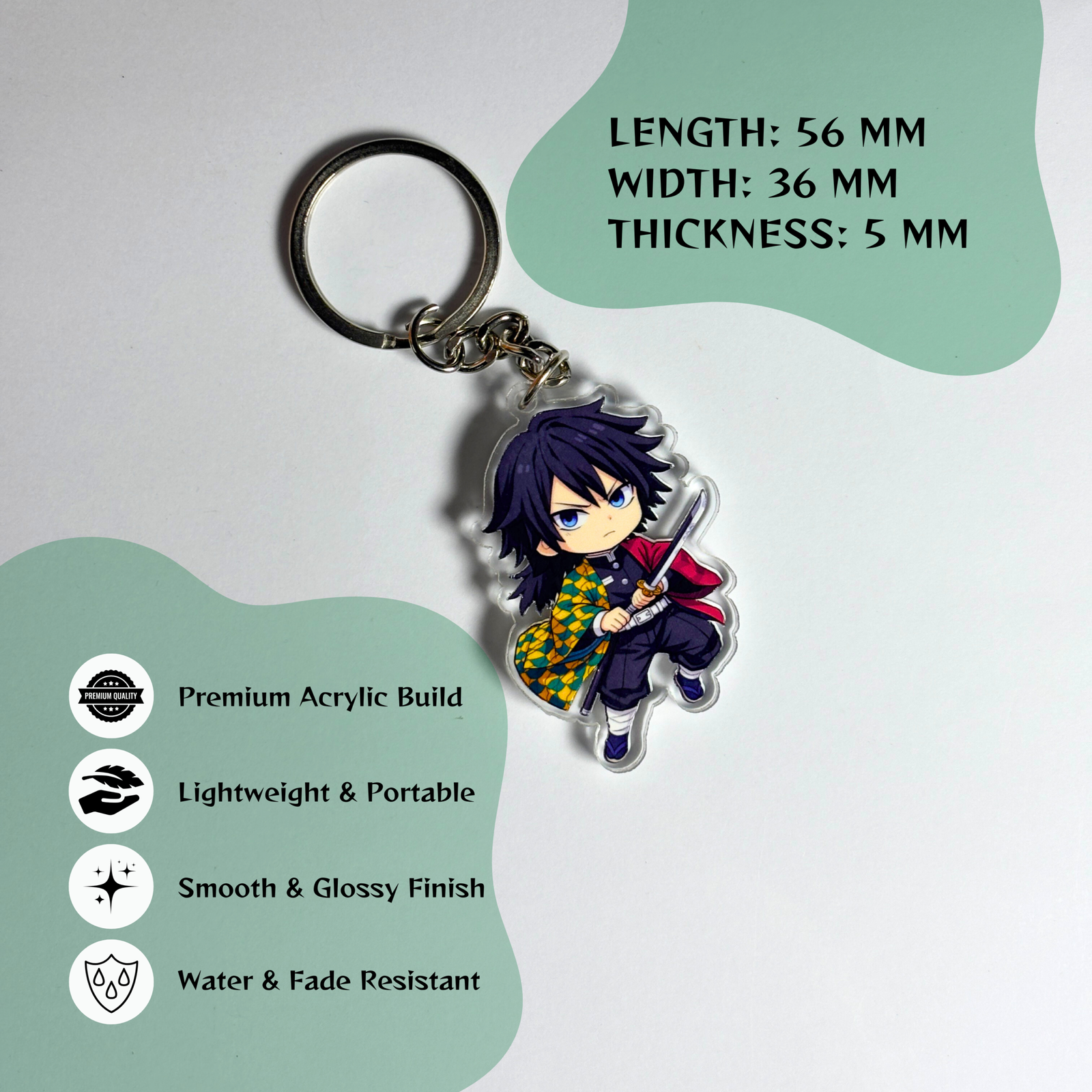 Ideal for anime lovers and collectors, this Giyu acrylic keychain combines cuteness, durability, and iconic character appeal in one stylish accessory.