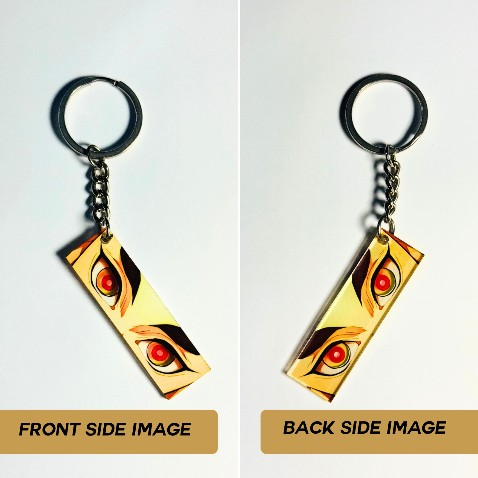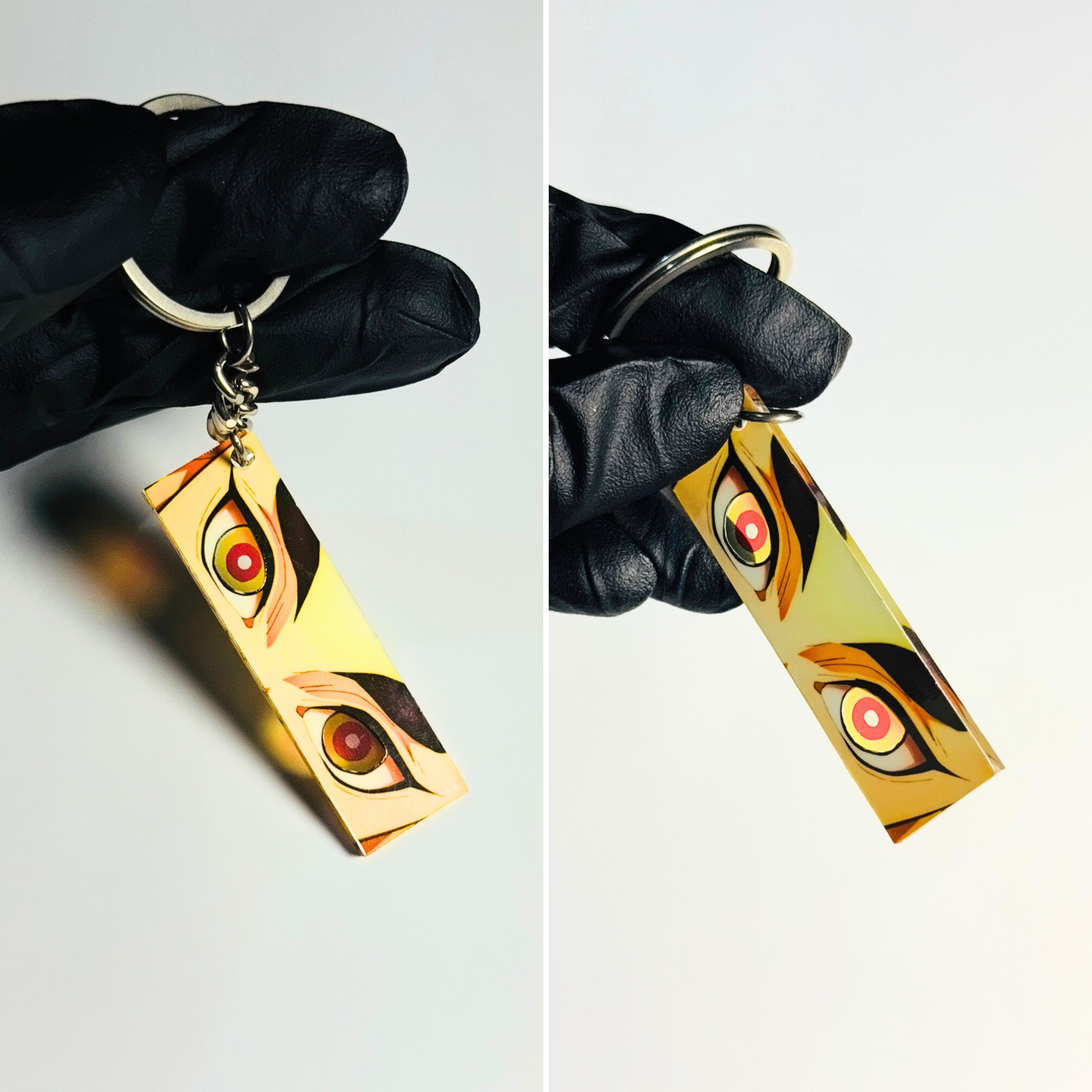 Carry the burning spirit of the Flame Hashira with this Kyojuro Rengoku Light-Reactive Glowing Eye Keychain, inspired by Demon Slayer: Kimetsu no Yaiba.
