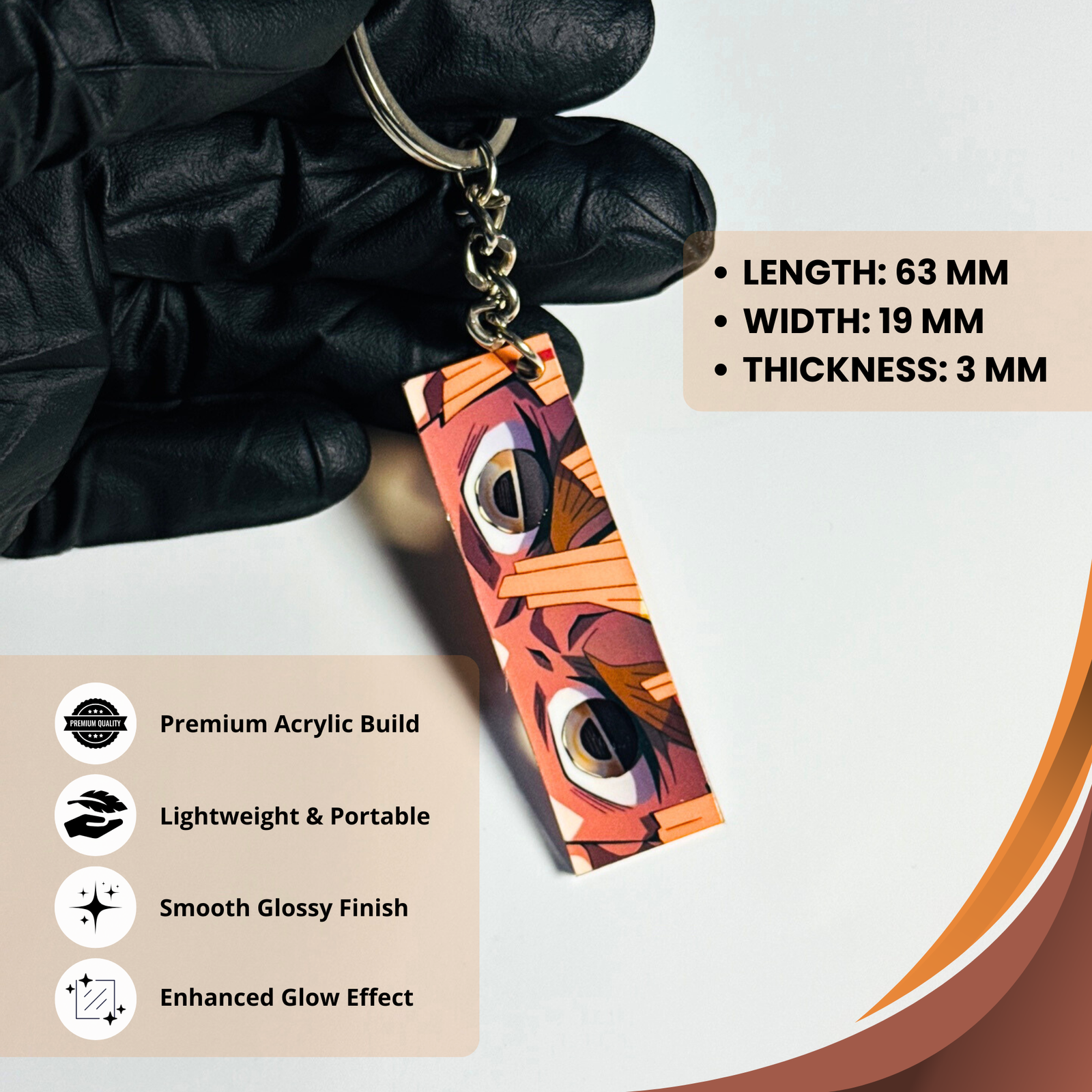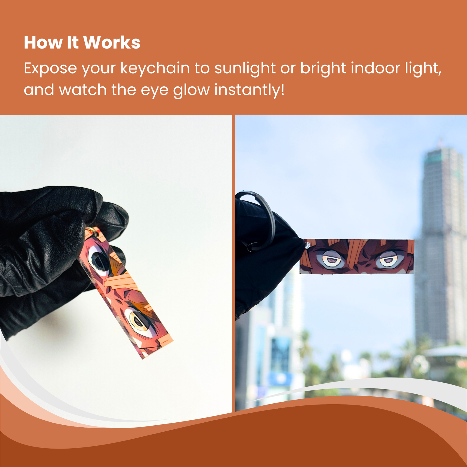 Crafted with exceptional detail, this keychain features light-reactive glowing eyes that illuminate whenever exposed to light—bringing out Zenitsu’s iconic intensity and lightning-charged expression. Made from durable, premium-quality materials, it’s ideal for attaching to keys, bags, backpacks, or cosplay outfits.